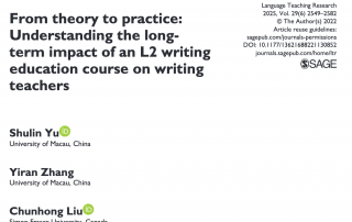 Yu, S*., Zhang, Y., Liu, C., & Lee, I. (2022). From theory to practice: Understanding the long-term impact of an L2 writing education course on writing teachers. Language Teaching Research. GalleryYu, S*., Zhang, Y., Liu, C., & Lee, I. (2022). From theory to practice: Understanding the long-term impact of an L2 writing education course on writing teachers. Language Teaching Research.